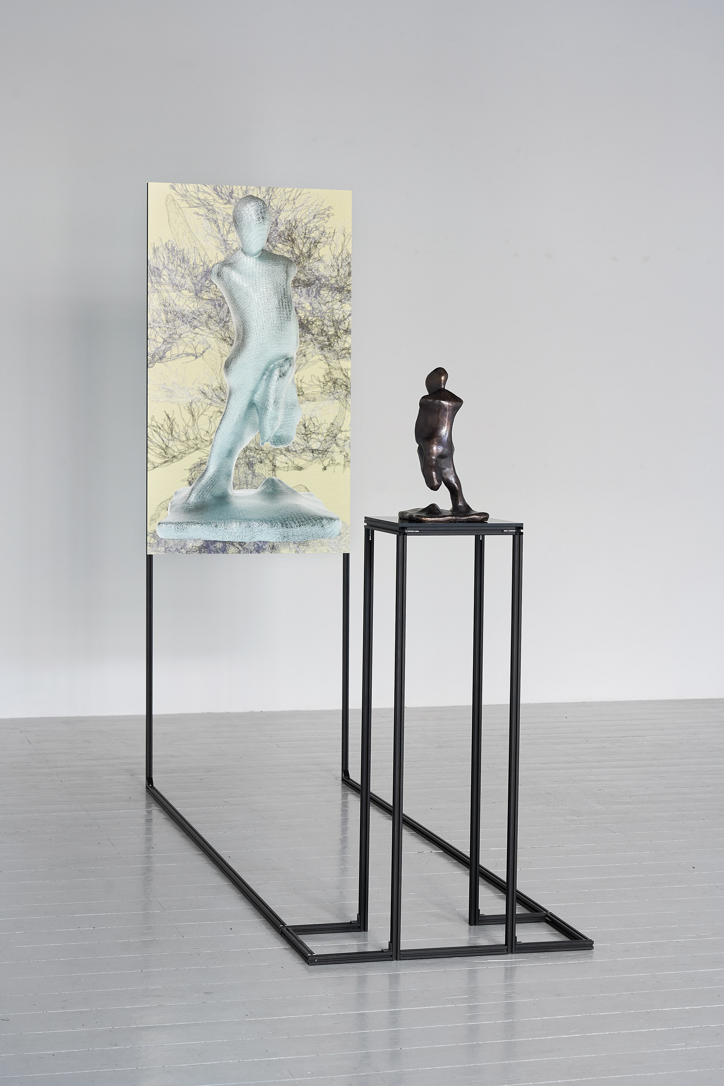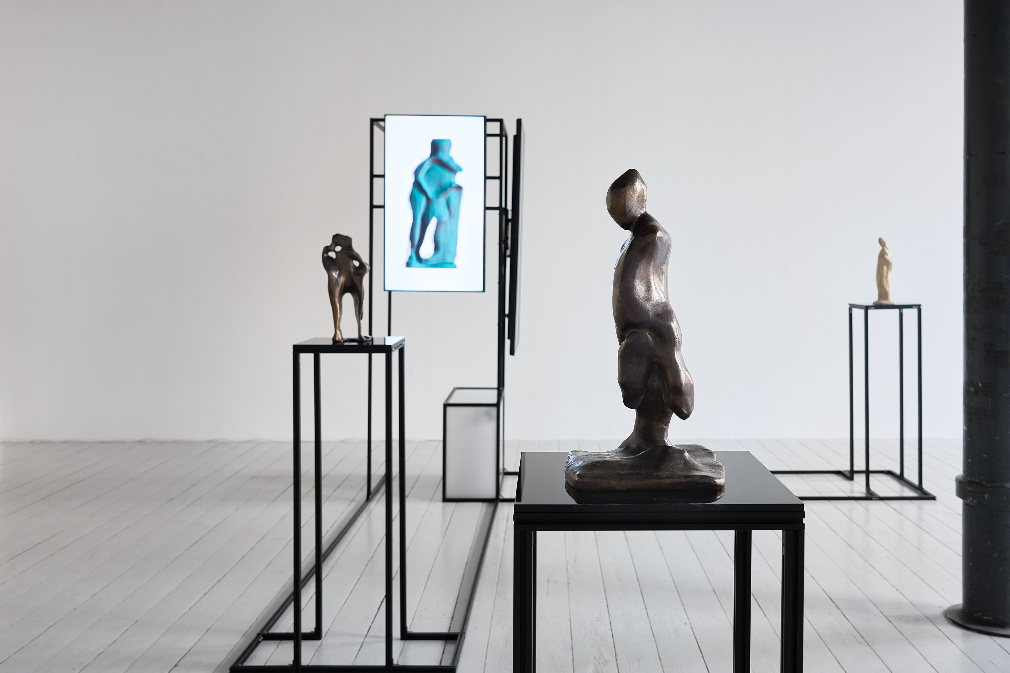 The exhibition features 3 sculptures that were created by the GAN and then placed in real space using classical sculptural methods, such as bronze casting. The presentation of the objects is complemented by a video installation that documents the working methods of the GAN. In it, sculptures can be seen in continuous succession which are created and output in real time by the GAN.